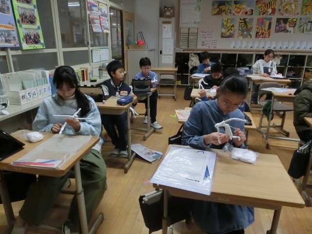 図画工作の学習「未来のわたし」で、どんな自分になりたいか考え、どんなポーズが一番その職業が表せるのかを針金を曲げて作りました。今日は、そこに粘土を付けていき、より立体的になるようにしていきます。どこにどれだけつけると人の動きに近づけるのかをそれぞれ考えながら、作っていました。