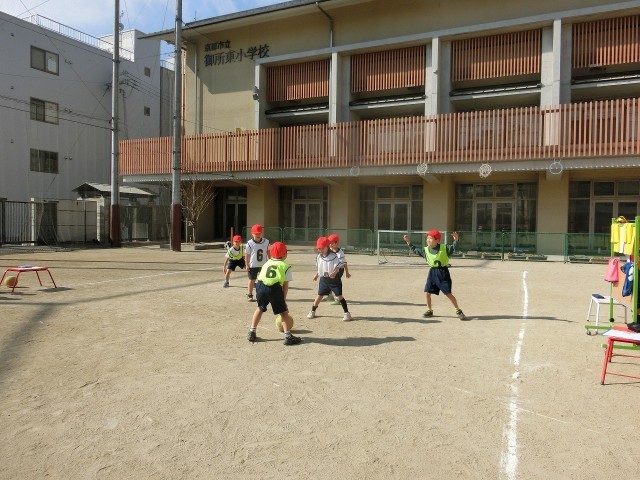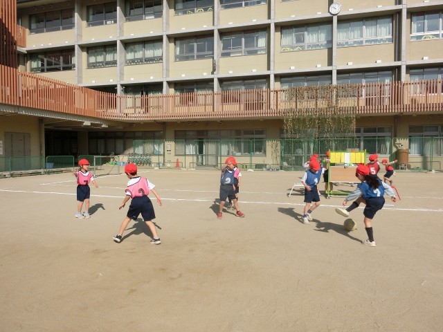 体育科では「ボールけりゲーム」の学習が始まりました。2学期の「パスゲーム」の経験を活かし、取り組み始めてすぐに自分たちでゲームを進めることができています。ボール蹴ることには不慣れな児童も多く、まだまだ「変なところにとんでいった!」「あれ、蹴ったと思ったのに」といった声が聞こえてきますが、楽しんでプレーできているようです。