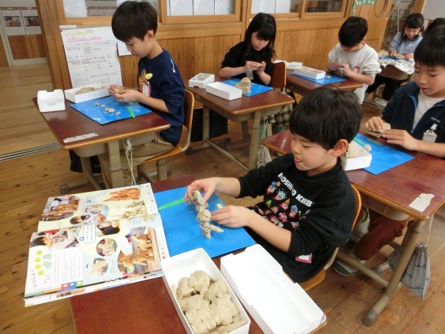 「誰とお散歩に行ったら楽しいかな?どこに行こうかな?恐竜さんの背中にのせてもらいたいな。お友達とおでかけしたいな」たくさん、アイディアが浮かんできます。手先を起用に使って粘土をくっつけたり、形を変えたりして自分のイメージした楽しいお散歩を表現しました。友達の作品も見て「わあ!すごい!!めっちゃいいいいやん!!」とお互いの素敵なところもたくさん見つけていましたよ!