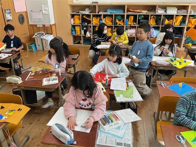 図画工作科「まどからこんにちは」の学習を頑張っています。カッターナイフでいろいろな窓を作り、そこから見えるものを絵で描いたり、画用紙で作ったりして見て楽しい作品が出来上がりつつあります。「いちごを画用紙で作ってみたよ!」「窓から滝が出てくるように画用紙をつなげて見たよ!」など、自分が工夫したことを嬉しそうに話してくれていました。