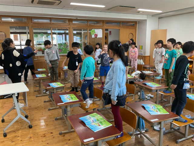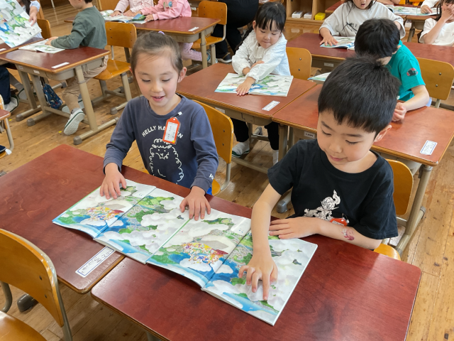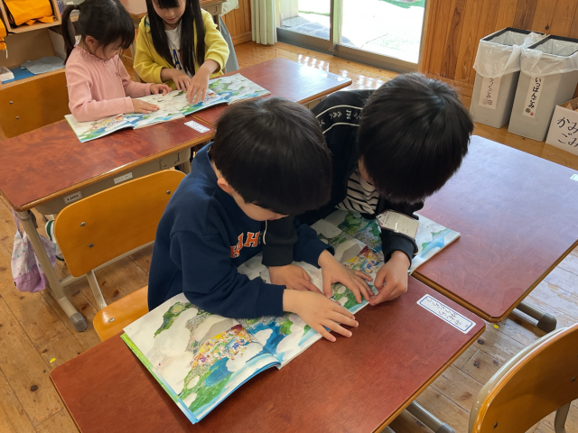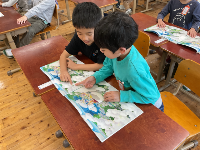 絵を見て何がうつっているかを話し合うときには、となり同士で机をくっつけて初めての2人学びを行いました。