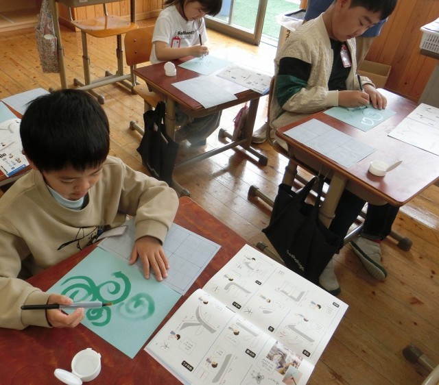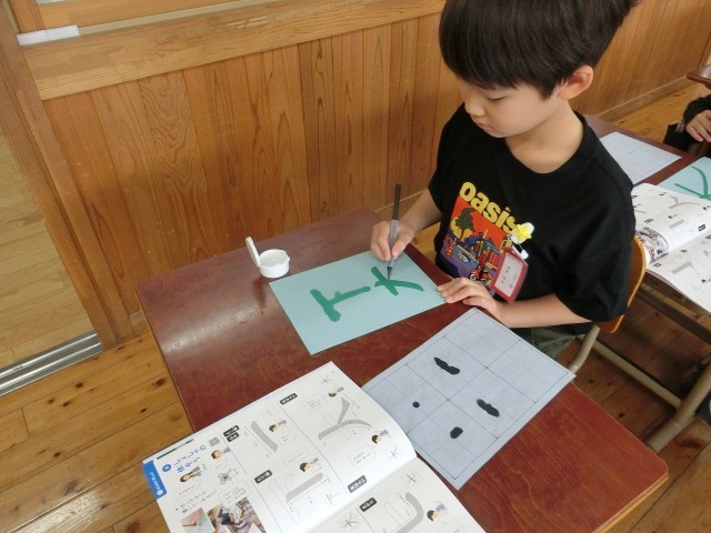 2年生の書写の学習が始まりました。最初の時間は、書写の基本となる姿勢や用具の扱いを確認する「しょしゃのたいそう」です。字を書く前の「準備」が大切で、背筋をピンとのばし、足の裏をしっかり床につけ、鉛筆を正しく持つことを意識しました。また、「とめ」「はね」「はらい」の力の入れ方なども意識しながら集中して字を書くことができました。ピンと伸びた背中から「2年生では、もっともっとかっこいい字を書きたい!」という意欲が伝わってくる、素敵なスタートの時間となりました。