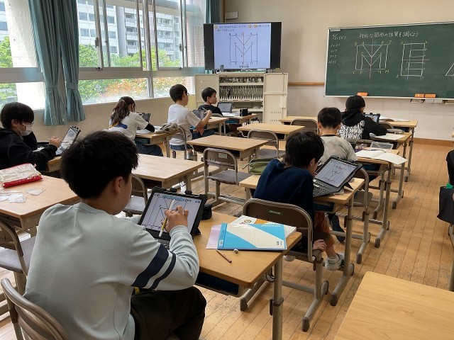 6年生 算数 公開日 2026/04/22 更新日 2026/04/22 学校の様子 6年生、算数の学習で「対称な図形」をしています。今日はコンパスや三角定規を使い、対称の軸からの長さや角度を測って、性質をまとめました。明日からは作図に挑戦します。