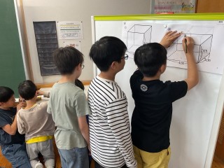 5年生は、2つの直方体を比べ、どちらが大きいかを考えました。一人でじっくりと考える子、友達と考えを伝え合いながら考える子など、それぞれに自分に合った学び方を見つけながら、学習を進める姿が見られました。