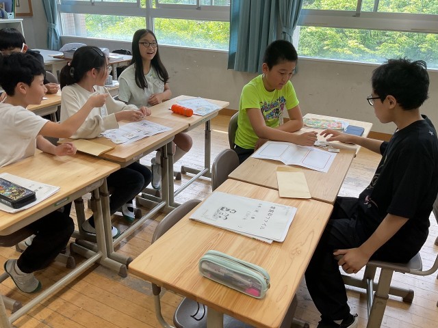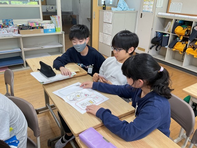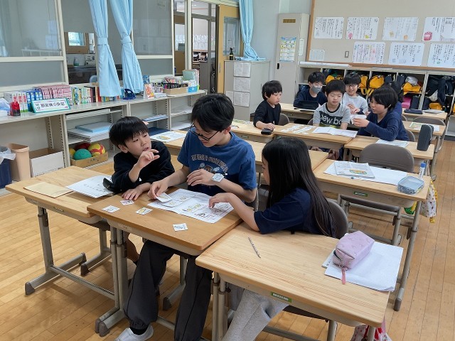 家庭科の学習で朝ごはんの大切さを学習しています。朝ごはんを食べるとどんないいことがあるのか、栄養バランスがいいものを食べられているのかを考えました。今日は実際のメニューでどんな食材が使われているのかを調べ、栄養素ごとに分けてみました。見た目の色どりや栄養素を考え、さらに朝ごはんなので手軽さも考え、何を足すとよりよいものになるのかをみんなで出し合いました。それぞれのアイディアでより栄養のあるメニューにすることができました。