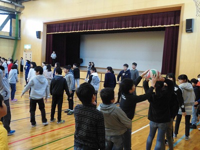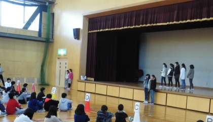 はじめに,A〜Hの交流グループにわかれ,子どもの司会進行のもとで,ボールおくりゲームをしました。交流について子どもたちに意見を聞くと,「中学で一緒のクラスになる前に仲よしになれる。」「最初と今を比べると,前よりも仲よくなれた。」といった声が聞かれました。