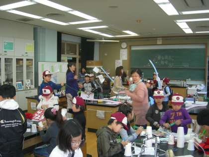 2階では,理科室で,「学力向上部会」の「知ってナットク!おもしろ科学教室」でみんなで静電気の体験をしたり,風船飛行機の工作をしたりしました。例年人気の理科実験,今年も目を輝かせて取り組む姿が見られました。図書室では,「読解・表現部会」の「ゲット!本はどこだ!」で,しりとり方式での本さがしが行われました。いつも親しんでいる図書室,本の場所を探すのも上手くいったようです。