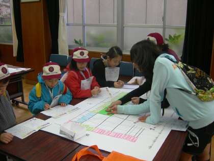 1階では,会議室で「人まち部会」の「アタック!たかくら十字路(クロスロード)」で京の通り名を地図の上に並べていく活動を行いました。何人かは,「わらべ歌」を知っている子もいて思ったよりスムーズに行うことができていました。視聴覚室では,「TAKAKURAコミュニケーション部会」の「世界の人たちと遊ぼう」で5カ国の外国の方に来ていただき,その国の言葉や様子を聞いたり,英語で質問したりする活動を行いました。様々な国の人とのふれあいを楽しんでいました。ランチルームでは,「高倉文化」部会の「エコアイデアで和を楽しもう」で,しじみの根付けづくりを行いました。しじみに和紙を貼り付け,かわいいストラップができていました。