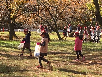11月2日(金)に御所へ秋をみつけに行きました。夏にも行っているので,秋になって変わったところを見つけようというめあてをもち,活動しました。「黄色や赤い葉っぱを拾ったよ。」「まつぼっくりが閉じているのと,開いているのがあったよ。」「帽子がついているどんぐりを見つけたよ。」いろいろな発見がありました。子どもたちは,見つけたまつぼっくりやどんぐりを宝物を見つけたみたいに「こんなの,見つけたよ。」と目を輝かせながら伝えてくれました。