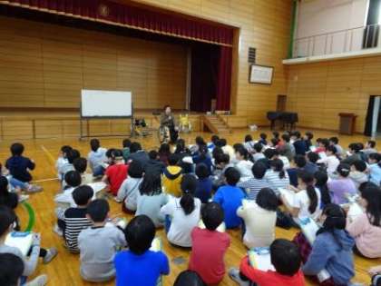 車いすバスケット用の車いすに乗る体験もさせていただきました。ほんの少しの体験でも,「とても疲れた。」「難しかった。」などの感想を話していました。今後の学習に生かしていってほしいです。子どもたちへの,貴重なお話や体験,本当にありがとうございました。