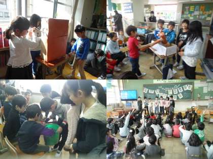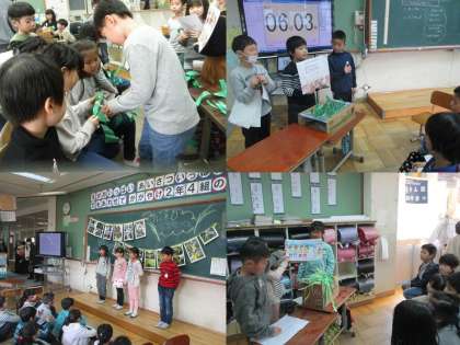 クラスごとに,「田植え」「稲刈り」「脱穀・もみすり」「餅つき」のグループに分かれて,自分達が学習したことをクイズにしたり,体験コーナーを設けたりしました。1年生に楽しんでもらいながら紹介することができました。最後に,昨年の2年生から受け継いだ「田んぼの鍵」を1年生にわたしました。どの子もやり切った表情を見せていました。