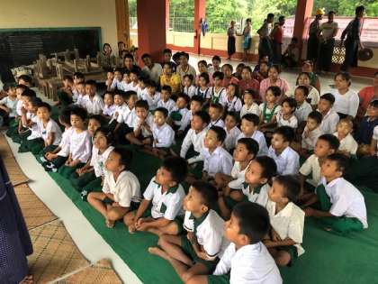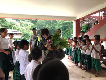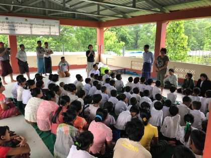 皆様、猛暑の夏休みいかがお過ごしでしょうか。さて、8月5日〜11日、高倉小学校・スマイル21プラン委員会を代表して、外務省無償支援事業(NPO SEEDS ASia)の専門家派遣としてミャンマーへ訪問してきました。ヤンゴンから車で5時間、小舟で30分、大雨の中、ヒンダタ地区ナベーゴン村に到着しました。雨季の多いミャンマーは水害によって、多くの地域が学校にも通えない状況になるのです。防災を切り口とした本事業ではすでに、災害用シェルターを兼ねた学校の建設がなされ、子供たちも学校に毎日通えるようになりました。次は、地域ぐるみでどのように学校運営をすればよいか、そのモデルやノウハウを求めているのです。私たちの学校はすでに150年前に地域がお金を出し合って学校をコミュニティの拠点として活用し、子供たちの教育に未来をかけてきました。そして今もなお、スマイル21プラン委員会という学校運営協議会制度を運用しながら常に地域ぐるみの学校運営を行っています。地域が学校のどんなことに参画できるのか、いざというときに誰がどのようにすればみんな安心して暮らせるのか、知りたい、学びたいという気持ちがひしひしと伝わってきました。子どもたちはどの国の子どもたちも目が輝いていて本当に可愛く思えました。この日は、学校がお休みにもかかわらず、私たちの訪問のために、多くの子どもも保護者も地域住民も学校に来て待っていてくれたのです。帰りは村長さんのバイクの後ろにしがみついてまたもや大雨の中を・・・・なかなかできない体験でしたが、自分の目で見る、知る、感じることがいかに大切か改めて認識しました。夏休みが終わったら、子どもたちにも話してあげたいです。