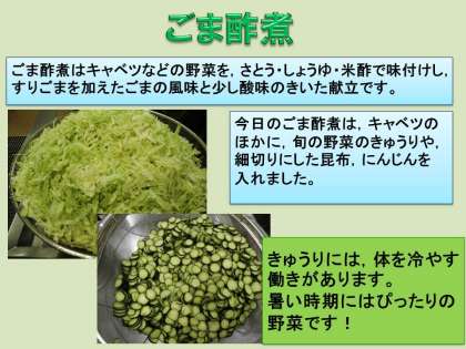 ごま酢煮は,酢を入れてからも加熱するので,酸味がまろやかになります。酢にふくまれる酢酸は,疲労回復効果があります。また,きゅうりには体内の水分を調節したり,暑い時期にほてった体を冷やしたりする効果があります。旬の野菜には,その時期にぴったりの栄養がたくさん含まれています。旬の野菜をたくさん食べてパワーを体に取り込みましょう!