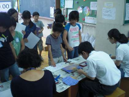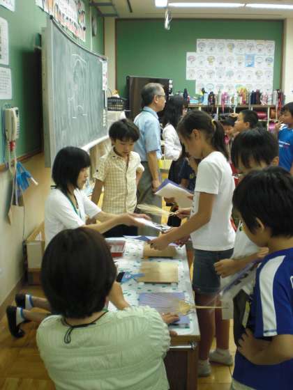 今年のプレゼントは、うちわです。先日の6年生の日曜参観で、すでに6年生は中学生に教えてもらって製作しました。今日は4・5年生が、中学生の説明を聞き中学校の保護者の方々にお手伝いしていただき、製作しました。