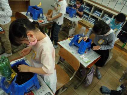 生活科「ぐんぐんそだて」の学習で,ミニトマトの種をまきました。初めて種を見たときには,その小ささにとても驚いており,「ごまみたい!」「こんな小さな種からミニトマトができるの?」など,可愛い反応を見せてくれました。