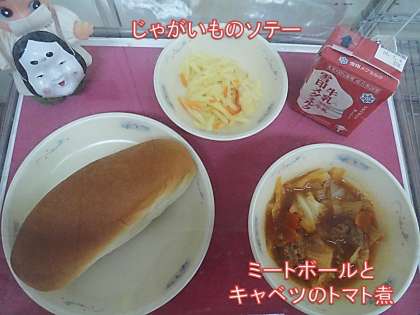 今日の献立は,「コッペパン・牛乳・ミートボールとキャベツのトマト煮・じゃがいものソテー」でした。