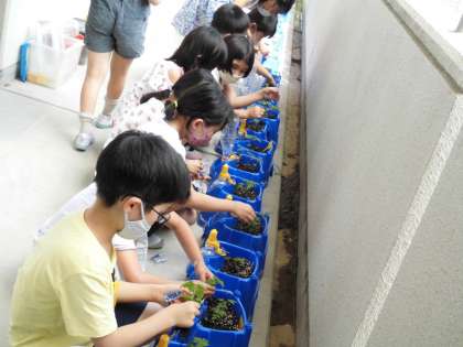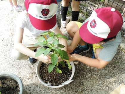 また,自分たちが選んだ野菜も,雑草抜きやまびき,支柱立てなど,丁寧に手入れをしました。実ができるのを楽しみにしながら,毎日水やりを忘れずに頑張ってお世話をしています。