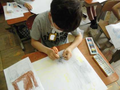 図画工作科の「ともだち見つけた」では,学校に隠れている妖精を見つけて絵を描きました。消火器が恐竜の妖精に見えたり,扉の取っ手が目のように見えたりと,子どもたちは色々なところから妖精を探し出すことができました。