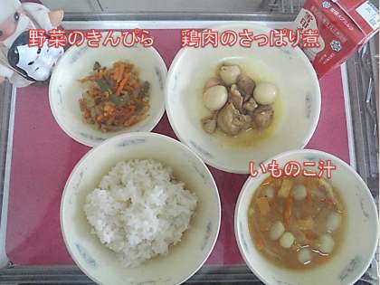 今日の献立は「ごはん・牛乳・鶏肉のさっぱり煮・野菜のきんぴら・いものこ汁」でした。
