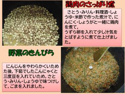 野菜のきんぴらは,にんじん・三度豆と一緒につきこんにゃくをいためて,ごまの風味をプラスしています。いろいろな食感が楽しめ,また野菜の献立ですがごはんにもよく合います。