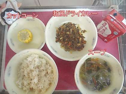今日の献立は,「麦ごはん・牛乳・和風ドライカレー・カットコーン・スープ」でした。