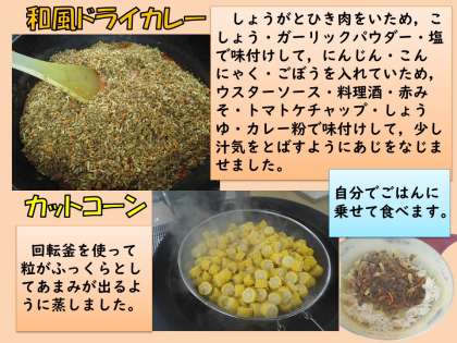 カットコーンは回転釜を使って蒸しています。じっくり蒸して火を切って少しおいておくことで,実がふっくらとしてあまみが出ます。こちらも子どもたちに大人気でした。