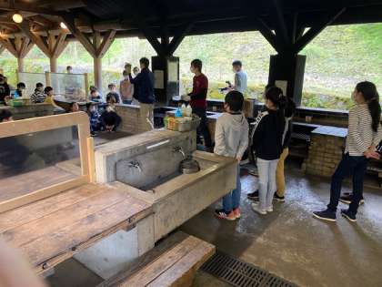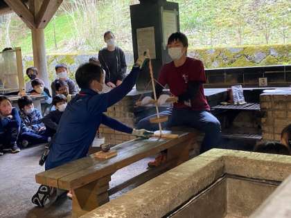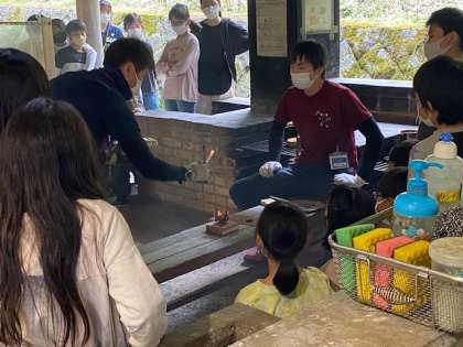 山の家の職員さんがお手本を見せてくださり,火が起こると子どもたちは歓声をあげています。