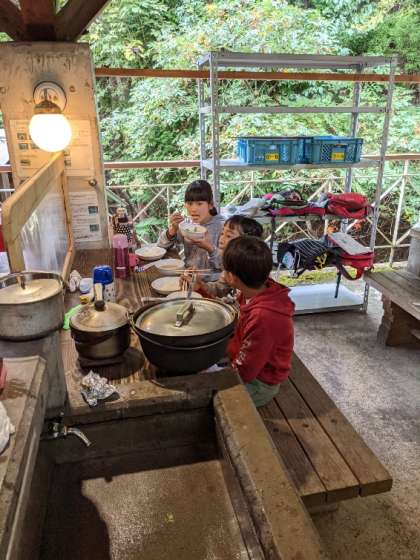 野外炊事,豚汁完成です。最高においしくてみんなの顔が笑顔になります。