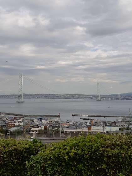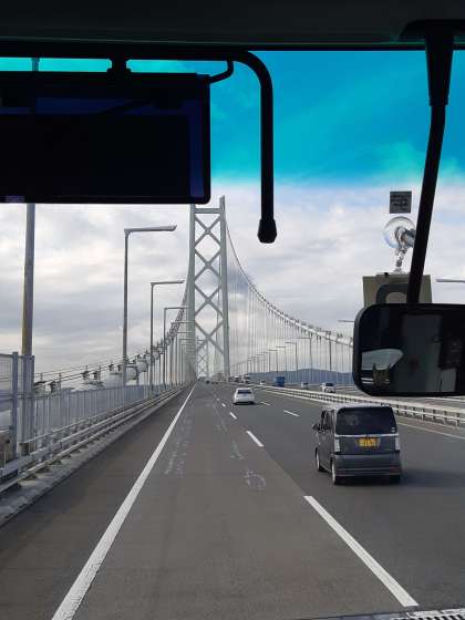 道中の景色です。明石海峡大橋を通りました。曇り空ですが,海がきれいに見えました。
