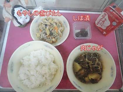 今日の献立は,「ごはん・牛乳・肉じゃが・もやしの煮びたし・しば漬」でした。