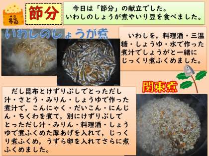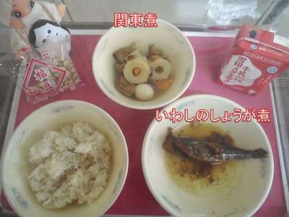 今日の献立は,「麦ごはん・牛乳・いわしのしょうが煮・関東煮・いり豆」でした。今日は節分です。節分には,豆やいわしを食べたり,豆まきをしたり,いわしと柊の葉を玄関などに飾ったりなどの風習があります。給食でもいわしのしょうが煮といり豆を食べました。