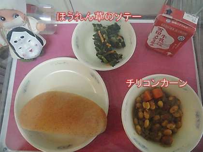 今日の献立は,「全粒粉パン・牛乳・チリコンカーン・ほうれん草のソテー」でした。