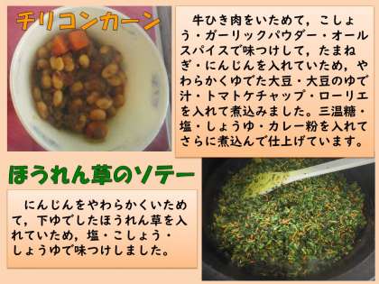 ほうれん草のソテーは,にんじんと下ゆでしたほうれん草をいためて,塩・こしょう・しょうゆで味つけしました。あっさり味のソテーはこってりしたチリコンカーンによく合います。ソテーは豆料理やシチューなどの副菜としてパンの日によく出てきます。ほうれん草や小松菜,コーンやにんじん,キャベツ,ひじきなどいろいろ種類や組み合わせがあります。どれも子どもたちに人気の献立です。