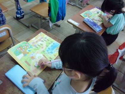 「とりは みんな すばこに はいれるか かんがえよう。」でした。教科書の絵を見ながら,1羽の鳥と1つの巣箱をそれぞれを対応させて線で結んでいきました。線でつないで確かめると,数が「おなじ」や数が「おおい」に気付くことができた子どもたちでした。算数の学習内容だけでなく,鉛筆の持ち方や下敷きの敷き方も学習するピカピカ1年生です★