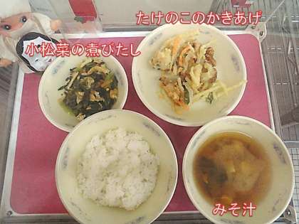 今日の献立は「ごはん・たけのこのかきあげ・小松菜の煮びたし・みそ汁」でした。