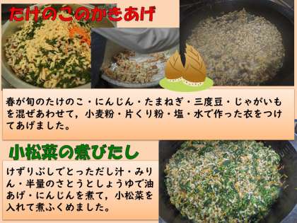 今日は旬のたけのこを使ってかきあげにしました。たまねぎ・にんじん・じゃがいも・ちくわと合わせて,小麦粉・かたくり粉・塩・水で作った衣をつけて揚げました。たまねぎ・じゃがいもも新たまねぎ,新じゃがいもと言って春においしくなります。新たまねぎは,加熱するとあまく柔らかくなります。子ども達も「たまねぎが甘くておいしかった」と感想を聞かせてくれました。たまねぎが苦手な子がお友達に「甘くておいしいよ」と教えってもらって「食べたら甘かった」とにこにこ完食していました。