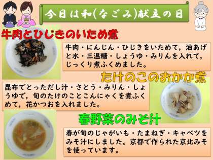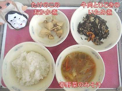 今日の献立は,「ごはん・牛乳・牛肉とひじきのいため煮・たけのこのおかか煮・春野菜のみそ汁」でした。今日は和食を食べて和食について知り,親しみをもつ「なごみこんだて」の日でした。高倉の子ども達は和食が大好きです。普段からだしのうまみやかおり,旬の食材を「おいしい」と嬉しそうに食べていますが,色々な和食を味わえ,和食について知ることのできる,月1回の和(なごみ)献立の日を楽しみにしています。今日は,たけのこ,じゃがいも,キャベツ,たまねぎと旬の食材をいろいろ使いました。ひじきも春が旬の食材です。乾物なので1年中食べられますが,春に収穫されます。