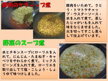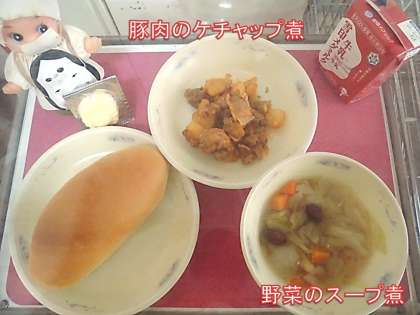 豚肉のケチャップ煮は豚肉をいためて,ケチャップ煮やウスターソース,さとうで味つけして,蒸したじゃがいもと合わせました。ケチャップソースがじゃがいもにしみて,少し崩れたじゃがいもが豚肉にからんでいました。子ども達もおいしそうに食べていました。残ったソースをパンにつけて食べていた子のいました。