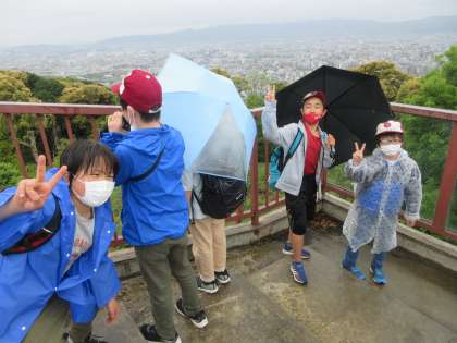 子どもたちは登山の疲れも忘れるくらい,青龍殿から見渡せる景色に見とれていました。そこからさらに高い展望台にも登り,京都市の絶景を満喫したあとは,丸山公園まで下りて待ちに待ったお弁当の時間です。お家の方が心をこめて作ってくださったお弁当を本当に美味しそうに子どもたちは食べていました。