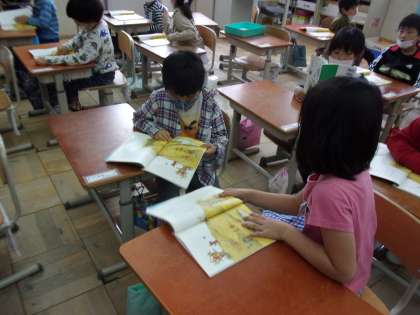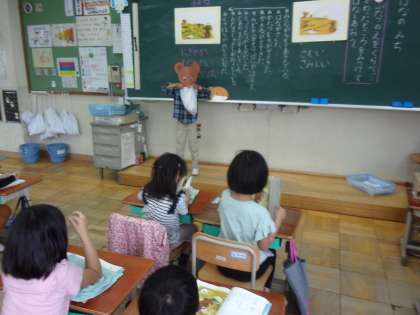 挿絵の様子から,くまさんとりすさんの会話を想像しながら音読したり,楽しく学習しています。