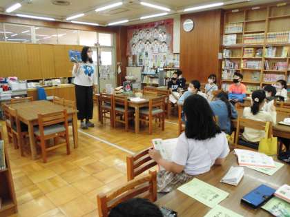 今日はマリア先生に図書館の使い方や本の素晴らしさを教えていただきました。本には背に住所が書いてあり,必ず元の場所に戻すこと。また,マリア先生のおすすめ本もたくさん紹介していただきました。