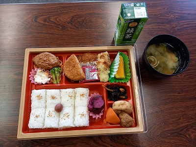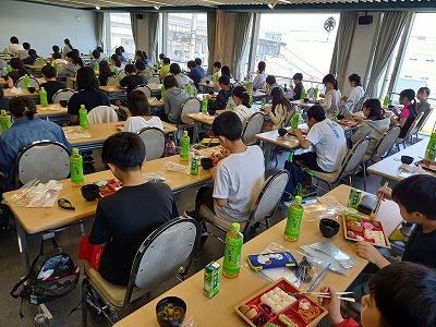まねき食品で美味しいご飯をいただきました。とても暑いですが,美味しいご飯と,PTAの方からいただいたお茶で,みんな元気になりました。