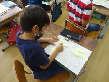 読解科「あつめてわけてはっけん!」の学習をしました。ふせんを使って,たべものを分類しました。「ラーメン,うどん,そば……麺の仲間だね。」「ふせんを使うとわかりやすいね。」「ふせんは入れ替えられるから便利だよ。」など,楽しそうに活動する子どもたちの姿が印象的でした。
