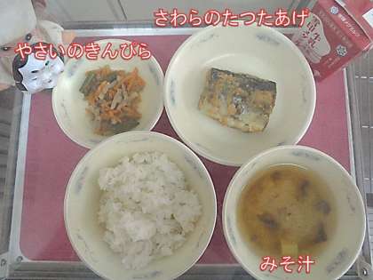 今日の献立は,「ごはん・牛乳・さわらのたつたあげ・やさいのきんぴら・みそ汁」でした。