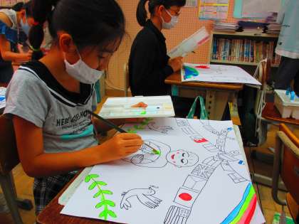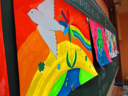 作品を描いていくときに,平和とは?,一人ひとりが多面的に考えるきっかけとなっていました。世界中の幸せや明るい未来などの思いを表現しようと,色の使い方,筆使いをじっくり考えながら作品作りをしていました。