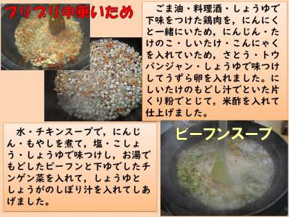 ビーフンスープは水とチキンスープで作ったスープでにんじん・もやしを煮て,お湯ですこしかためにもどしたビーフンとチンゲン菜を入れました。味付けは,塩・こしょう・しょうゆ・しょうがのしぼり汁でしました。ビーフンは米粉で作られた麺です。中国や台湾,東南アジアの国でよく食べられています。つるつるしたビーフンや野菜がたっぷり入って,こちらも子ども達は喜んで食べていました。しょうがの風味がさっぱりして,しっかり味のプリプリ中華いためとよく合います。