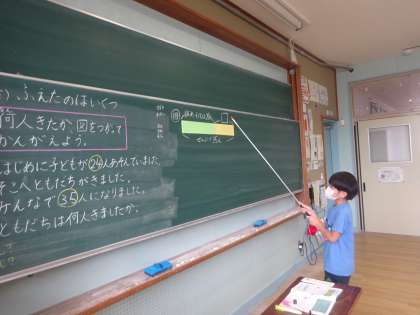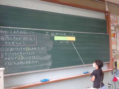 算数科「図を使って考えよう」の学習をしました。文章題を,図を使って考えます。「どうしてひき算になるのかな。」「全部の数からはじめの数を引くと答えがわかるからだよ。」「〇〇さんの説明でわかったよ。」など,友だち同士で説明し合いながら学習しました。