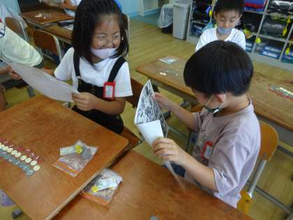 算数科「100をこえる数」で学習したことをもとに、上手にお買い物ができる「おかいものマスター」を目指しています。今日はそのレベル1「品物の値段ぴったりの硬貨を支払おう」に挑戦しました。実際のスーパーのチラシを見ながらお金を操作して、ペアで買い物ごっこをしました。次回はレベル2に挑戦です。