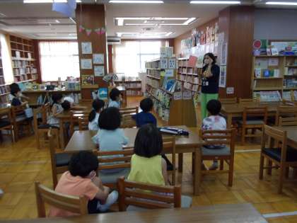 図書館へ行って,本を借りたり,読書をしたりして本に親しんでいます。図書館へ行くのを楽しみにしている子がたくさんいます。今日は,マリア先生の大好きな絵本「すいかのたね」を読み聞かせしてもらいました。来週は,夏休み中に借りる本を選びます。これからも,素敵な本との出会いがあるといいなと思います。