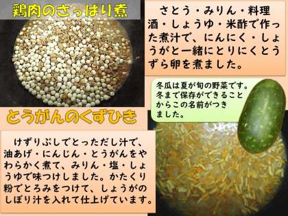 とうがんのくずひきは、旬のとうがんをけずりぶしでとっただし汁で油あげ・にんじんと一緒に煮て、みりん・塩・しょうゆで味つけしています。かたくり粉でとろっろとろみをつけてからしょうがのしぼり汁を入れて少しさっぱりと仕上げました。とうがんは食べやすいように皮を厚めにむいています。1年生はとうがんを初めて食べる子もいて、「冬瓜ってどれ?」と探していました。「食べてみるとトロトロでおいしい!」と嬉しそうに食べていました。